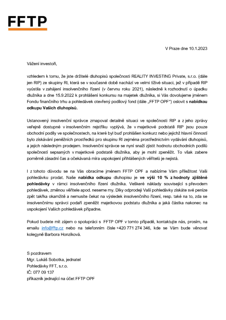 níže Vám zveřejňujeme nabídku, která nám byla zaslána k rozdistribuování, jelikož Vás zastupujeme v předmětné kauze.